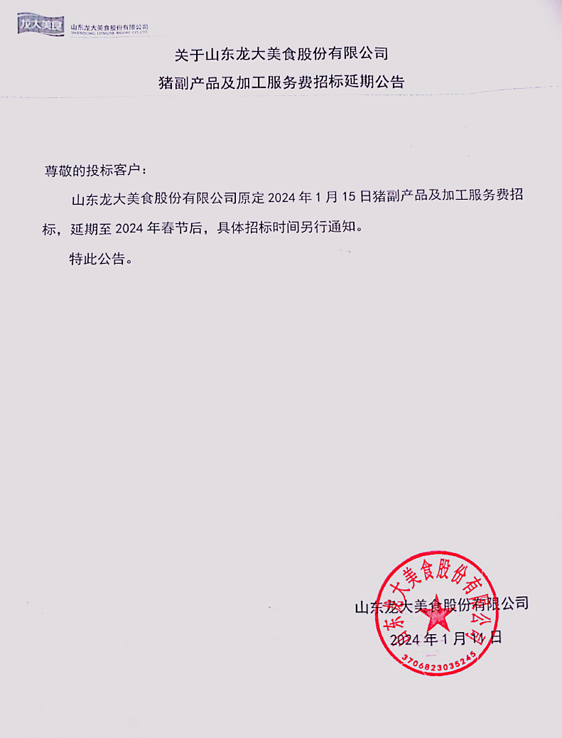 vwin德赢网页版原定2024年1月15日猪副产品及加工服务费招标,延期至2024年春节后,详细招标时间另行通知。