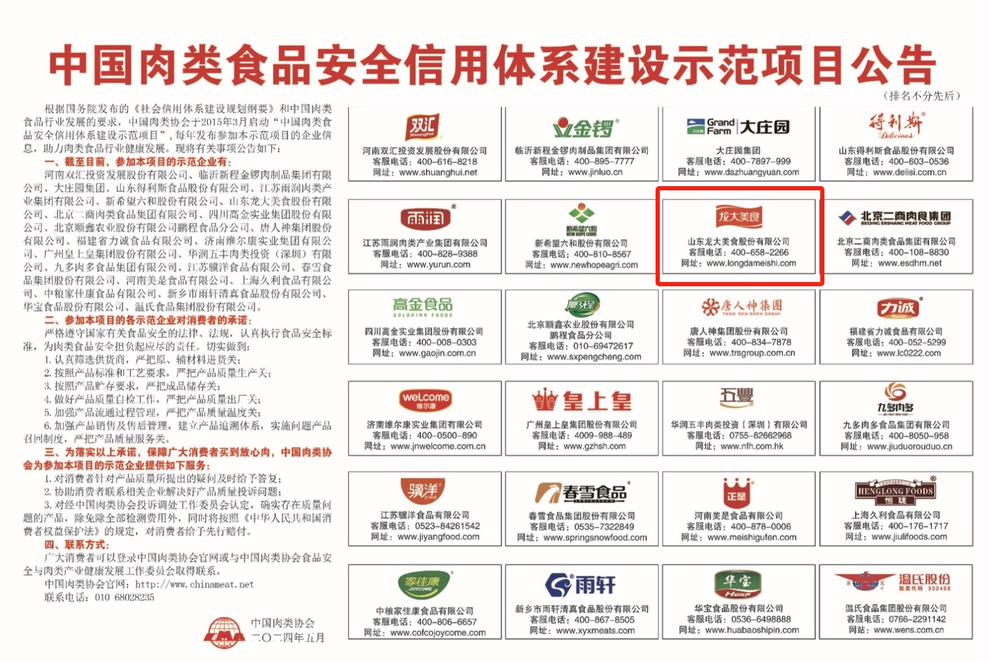 2015年,中国肉类协会凭证国务院宣布的《社会信用系统建设妄想纲要》和中国肉类食物行业生长的要求,启动了“中国肉类食物清静信用系统建设树模项目”,以后每年宣布加入该树模项目的企业信息,助力肉类食物行业康健生长。入选该项目的各树模企业需严酷遵守国家有关食物清静的执法、规则,认真执行食物清静标准,为肉类食物清静担负起应尽的责任。
